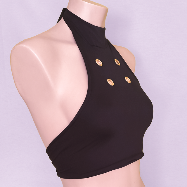 Top de bikini inspirado en el estilo de Jinx en Arcane. Ajuste perfecto y diseño icónico con tiras y botones dorados.