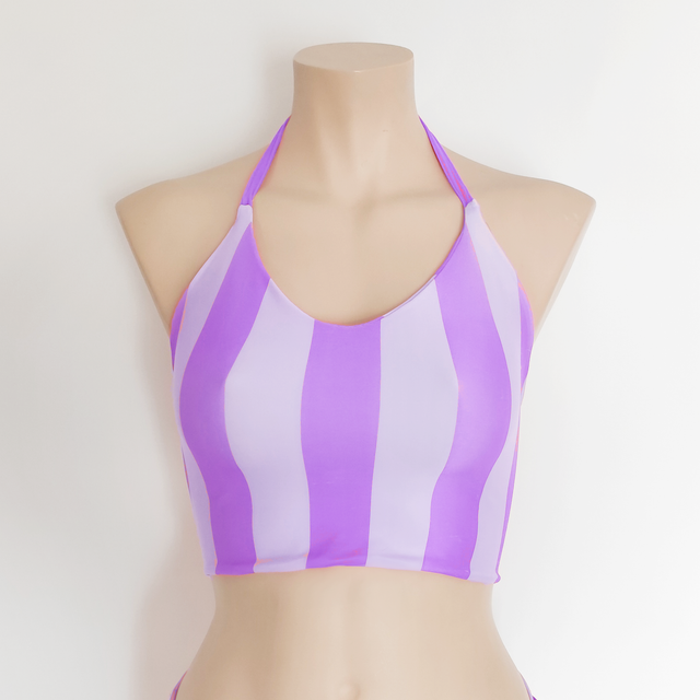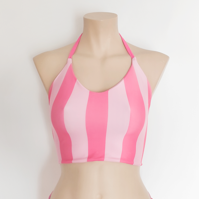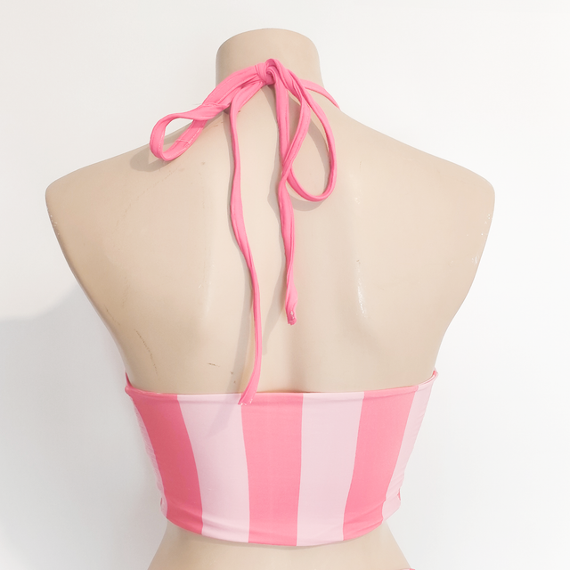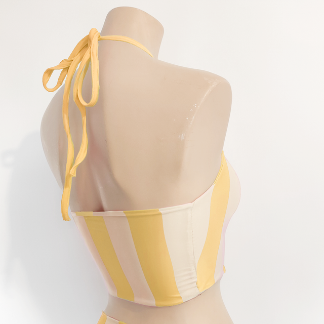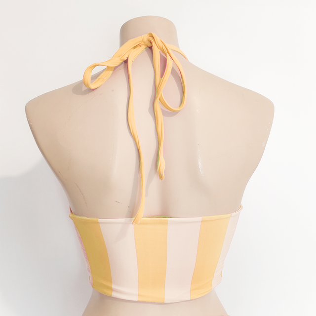 Top de bikini halter a rayas verticales, ajustado al cuello y de estilo deportivo. Combinación de colores llamativos para destacar este verano.