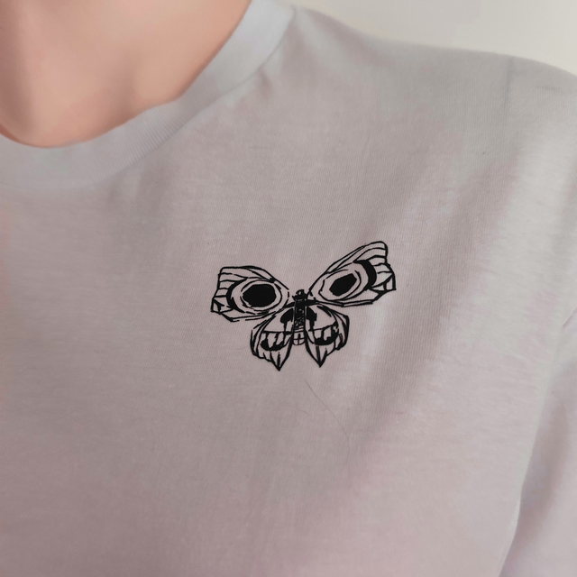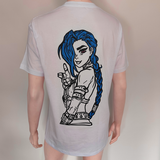 Camiseta blanca con diseño frontal de mariposa y espectacular ilustración trasera de Jinx, inspirada en el universo de League of Legends. Estilo urbano con toque rebelde y detalles en azul eléctrico. Ideal para fans del caos.