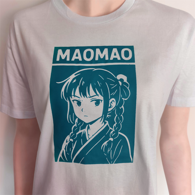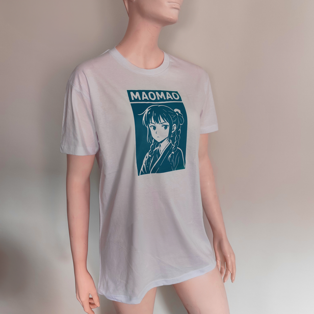 Camiseta blanca con ilustración de MaoMao en color verde azulado estilo manga. Suave y cómoda.